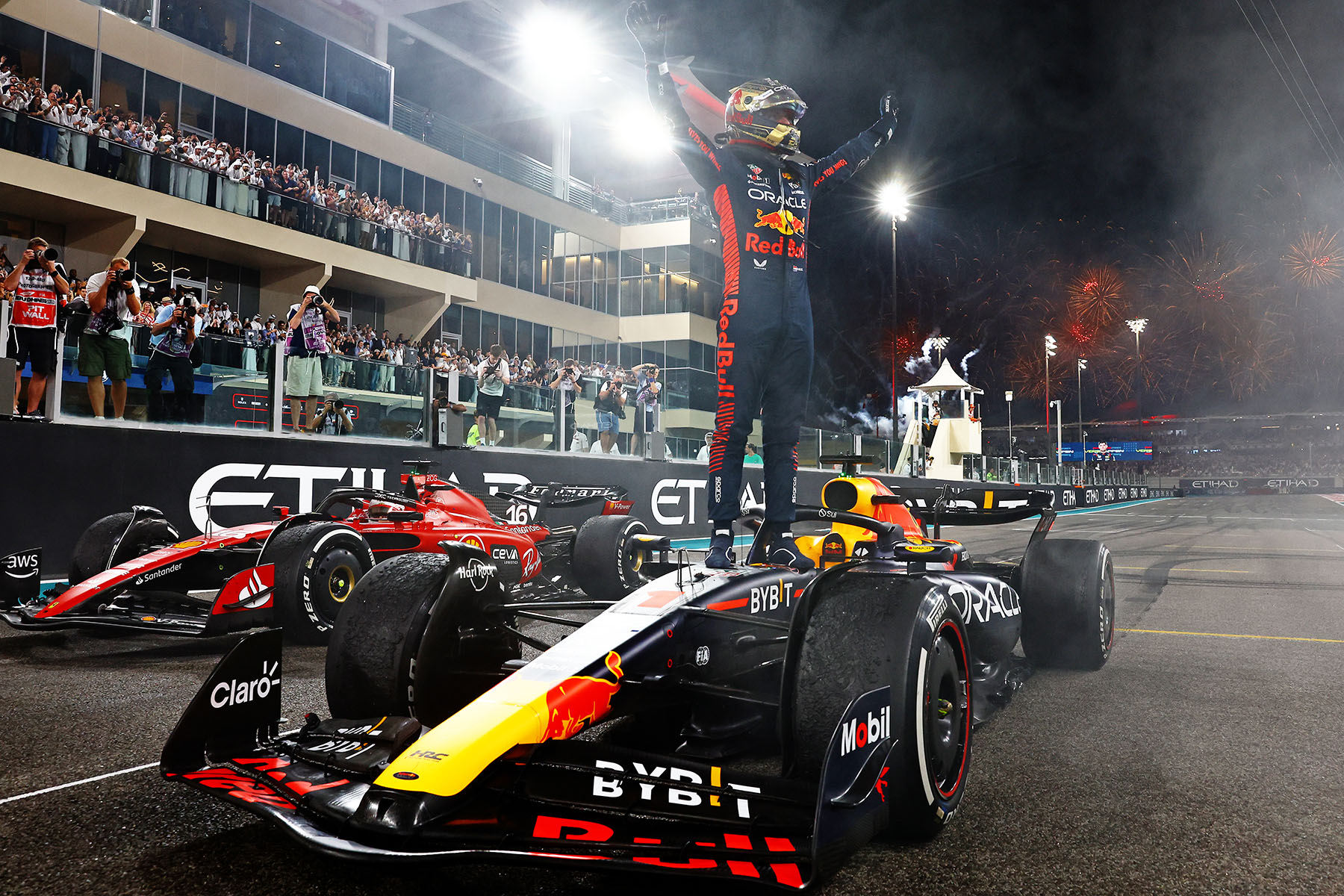 Erster Verfolger sind die Roten auch am Sonntag auf Yas Island, allerdings in Person von Charles Leclerc, der hinter Verstappen Zweiter wird, den Niederländer aber nur in der Startrunde ernsthaft herausfordern kann.