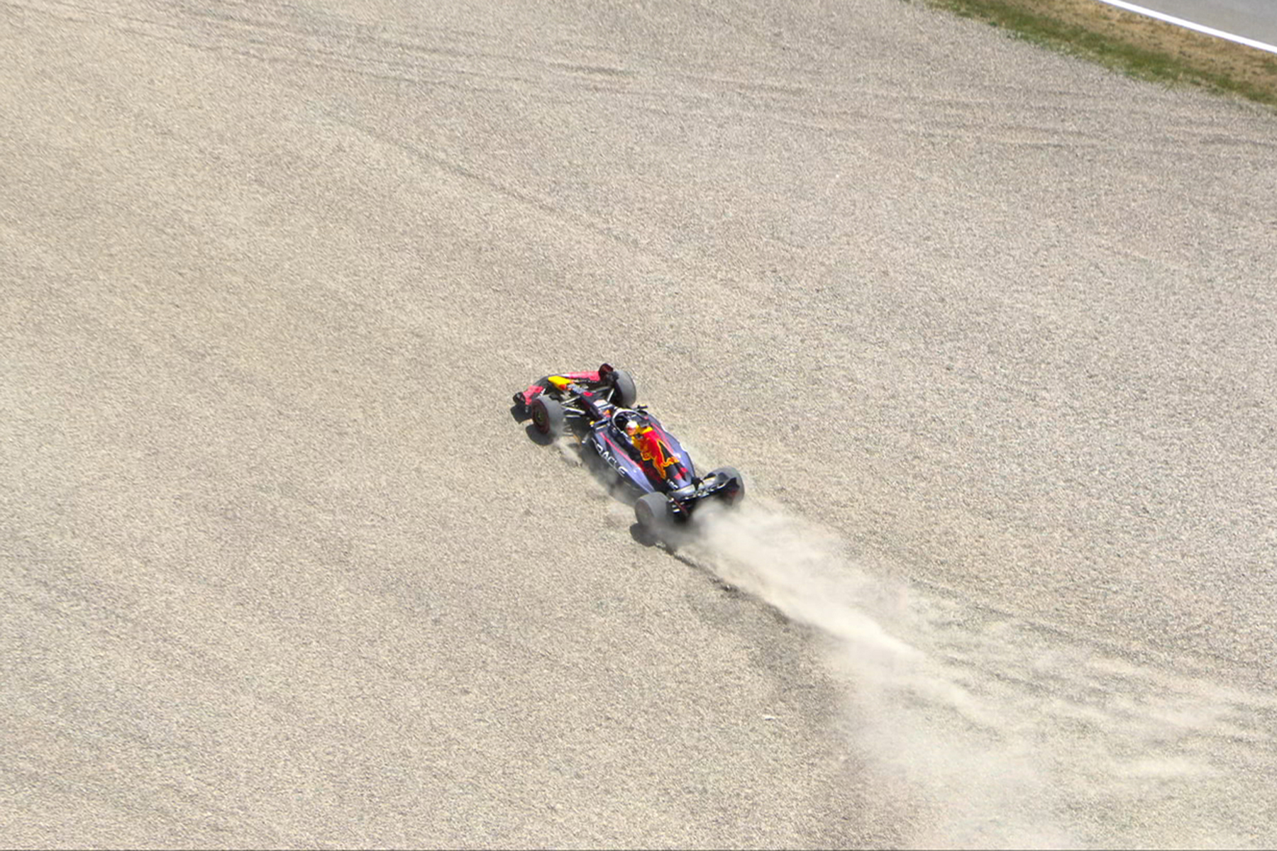 Runde 10: Verstappen rutscht an der gleichen Stelle in den Kies wie Sainz zuvor. Grund: eine Windböe. Der Red Bull-Star fällt zurück auf P4, hat zehn Sekunden Rückstand auf Leclerc.