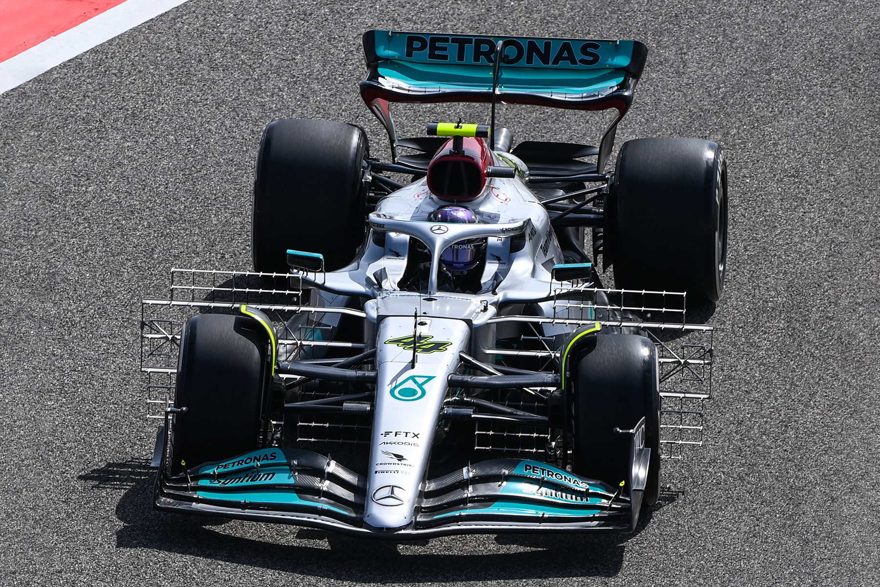 Die Konkurrenz traute beim Aufstellen fürs Gruppenfoto vorm zweiten Formel-1-Test 2022 in Bahrain ihren Augen nicht. Als Mercedes seinen Silberpfeil mit Namen W13 aus der Garage schob, stimmte etwas nicht mit der Form des Rennwagens. Beim genaueren Hinschauen war klar: Die Seitenkästen sind genau wie die Kühlschlitze ultraschlank und extrem hochformatig gebaut.