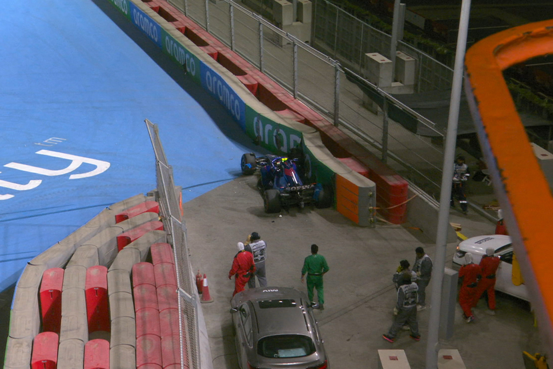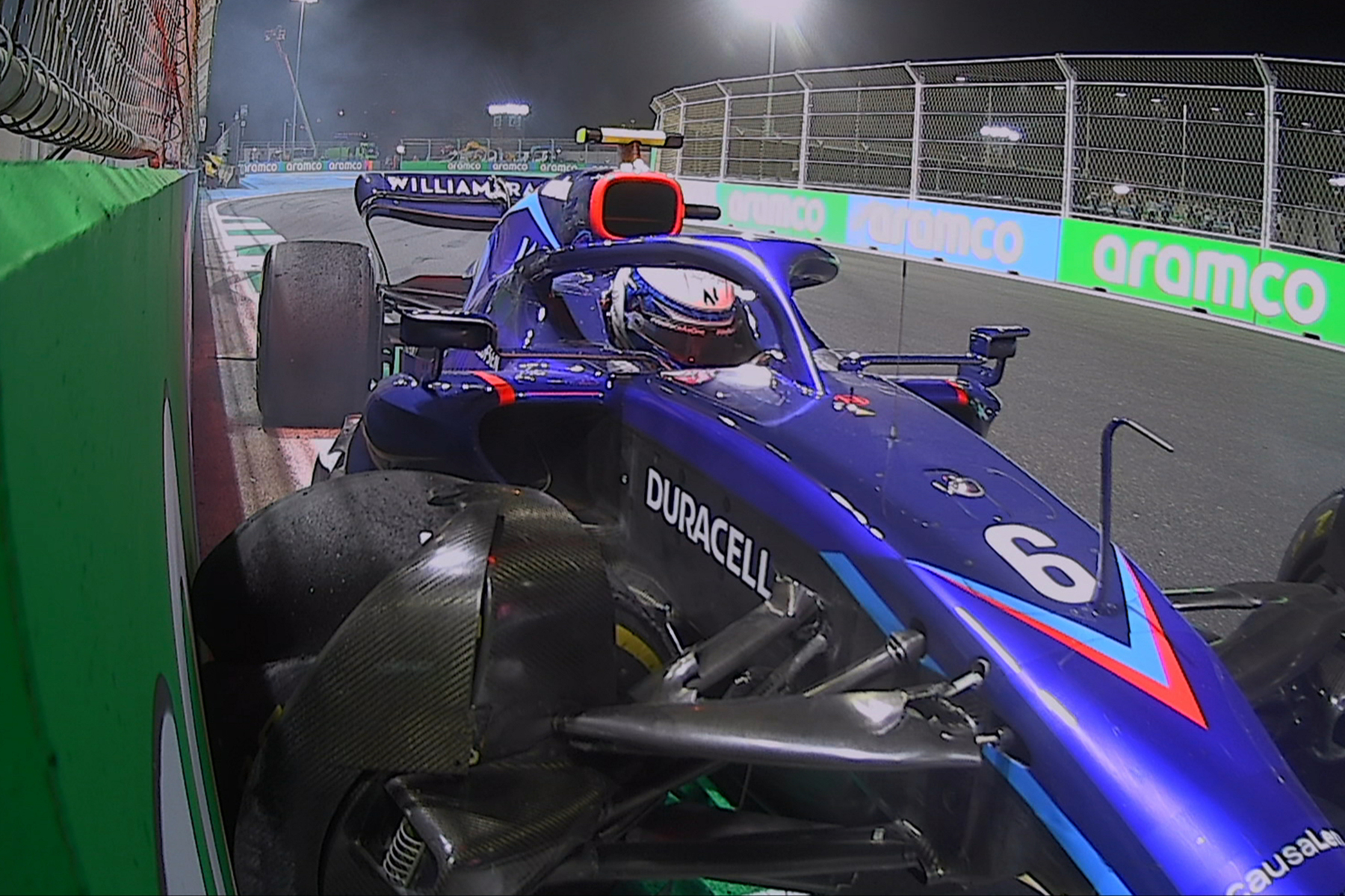 Runde 17: Nicholas Latifi schlägt mit seinem Williams wie schon im Qualifying in die Mauer ein. Tatort: letzte Kurve. „Das war erste Klasse Volksschule“, kommentiert Ralf Schumacher bei Sky. Leclerc und Verstappen kommen zum Stopp, Sainz ebenso. Safetycar. Leclerc führt jetzt vor Verstappen, Perez und Sainz.