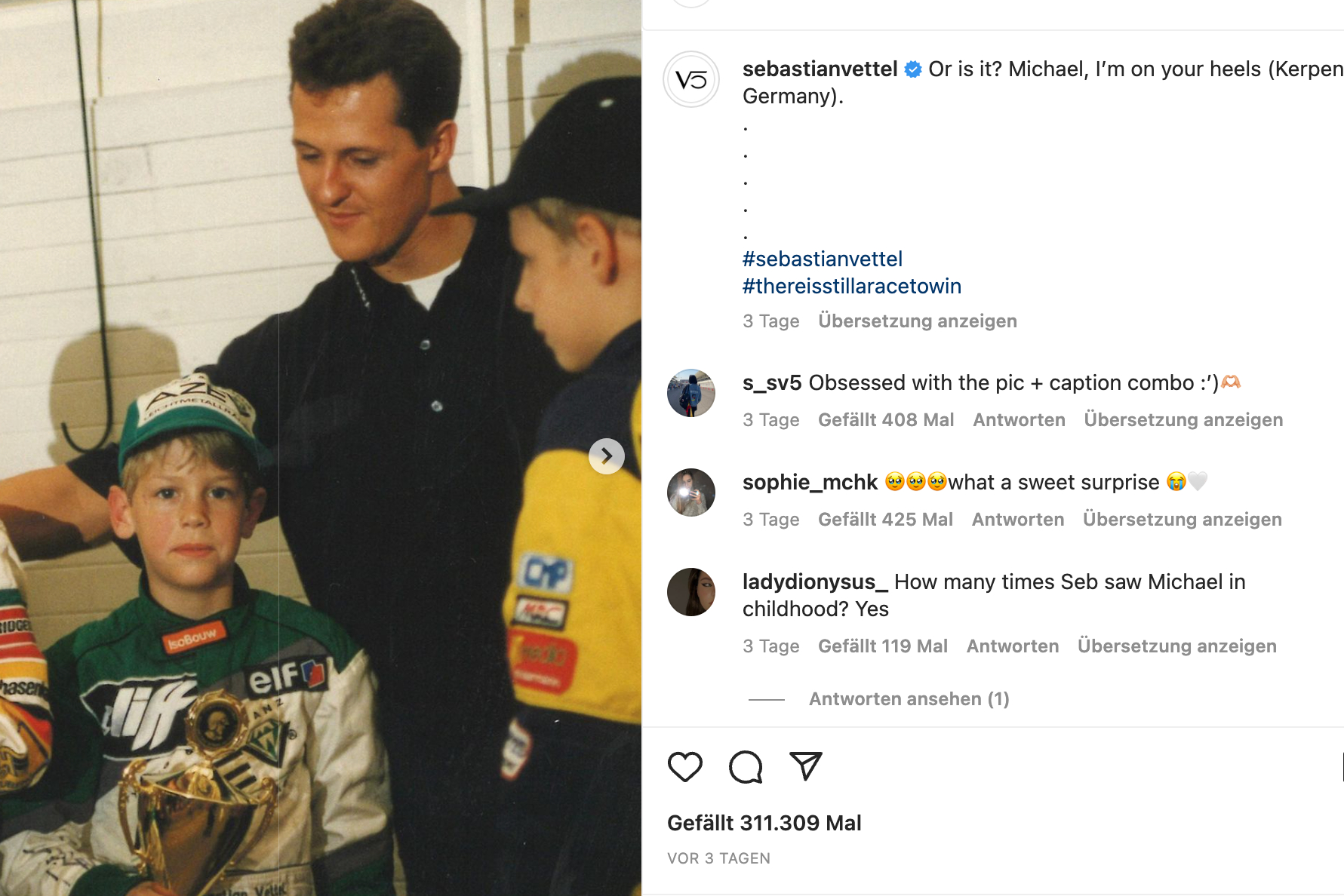 Dafür, dass auch Vater Michael nicht in Vergessenheit gerät, sorgte an Weihnachten indes ausgerechnet Schumi-Kumpel Sebastian Vettel: Der Heppenheimer hält seine Familie bekanntlich aus der Öffentlichkeit raus, postete stattdessen lieber ein Kinderfoto mit seinem Jugendidol Michael Schumacher auf der Kartbahn in Kerpen.