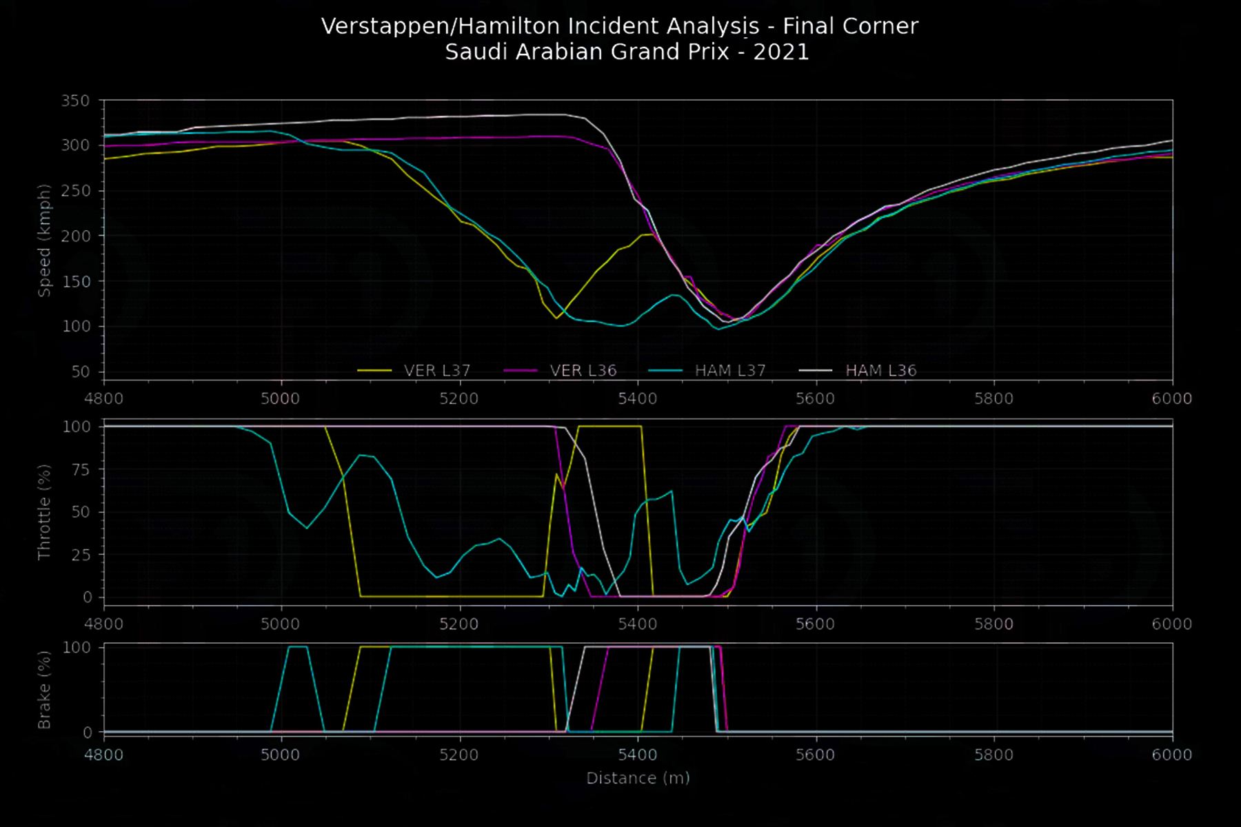 Doch Telemetriedaten der Formel 1 zeigen, dass der Niederländer bis Tempo 140 gleichmäßig verlangsamt, dann bis Tempo 110 tatsächlich etwas stärker verzögert. Hamilton antizipiert das Manöver seines Rivalen bis dorthin, betätigt in der finalen Phase vorm Crash aber laut Formel-1-Telemetrie noch einmal ganz leicht das Gaspedal, bevor Verstappens Heck formatfüllend vor seinem Visier erscheint.