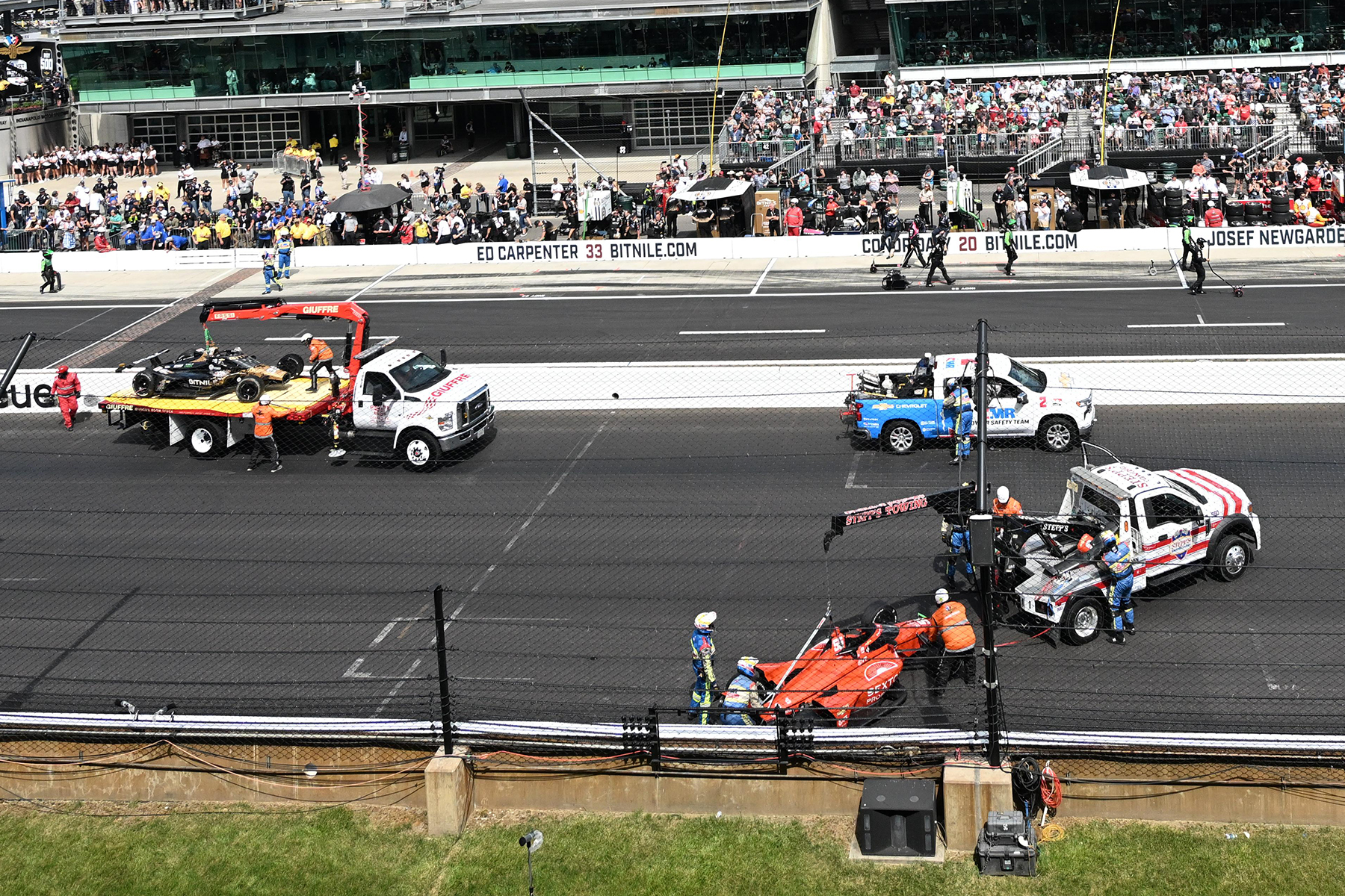 Elf Fahrer scheiden mit Unfällen aus, alle bleiben unversehrt. Der erste Crash passiert dabei erst in Runde 92, also fast bei Rennhalbzeit. Auch Ex-Formel-1-Pilot Romain Grosjean landet wie im Vorjahr in der Mauer. Ebenso wie McLaren-Pilot Patricio O’Ward, der die meisten Runden des Rennens geführt hat.