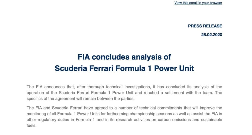 Jetzt zeigt der Automobilweltverband mit dem Finger auf Ferrari, schreibt in einer Pressemitteilung: „Die FIA gibt bekannt, dass sie nach gründlichen technischen Untersuchungen ihre Analyse des Betriebs des Formel-1-Triebwerks Scuderia Ferrari abgeschlossen und eine Einigung mit dem Team erzielt hat. Die Einzelheiten der Vereinbarung bleiben unter den Parteien.“