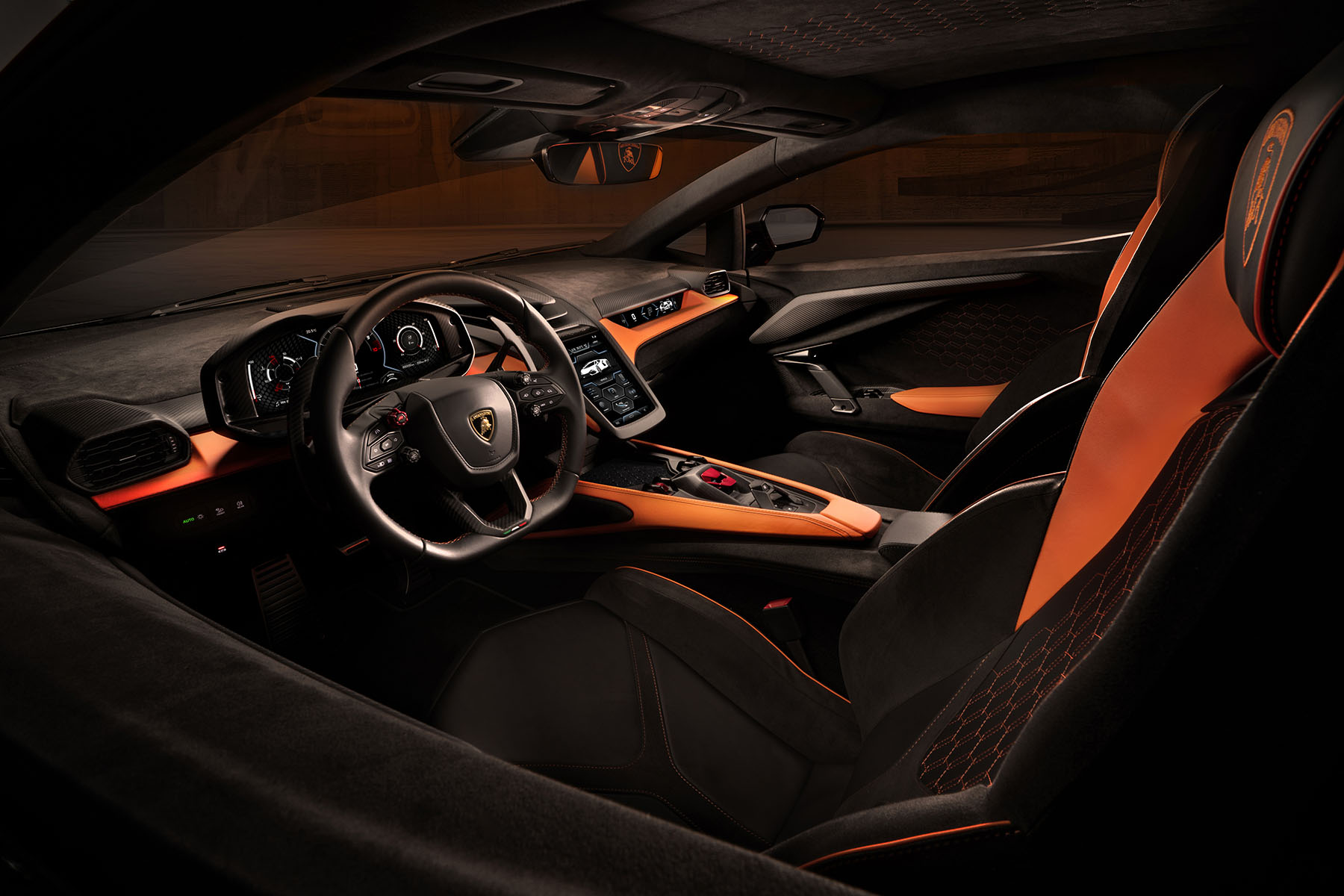 Der Innenraum verfügt über drei digitale Bildschirme. Während der Fahrer die Informationen auf dem 12,3 Zoll großen digitalen Kombiinstrument erhält, werden die Daten für den Beifahrer simultan auf einem 9,1 Zoll großen Bildschirm vor ihm dargestellt. Dazwischen befindet sich ein 8,4 Zoll großer, vertikal ausgerichteteter Multimedia-Touchscreen. Der Revuelto ermöglicht auch das Swipen. Damit können Fahrer und Beifahrer Apps und Informationen vom zentralen Bildschirm nach links und rechts schieben. Vier Drehschalter an den Speichen des Lenkrads ermöglichen die Wahl der Fahrmodi, die Höhenverstellung des Fahrwerks und die Neigung des Heckspoilers. Auch die Blinker lassen sich per Tastendruck bedienen, damit der Fahrer immer beide Hände am Lenkrad behalten kann.