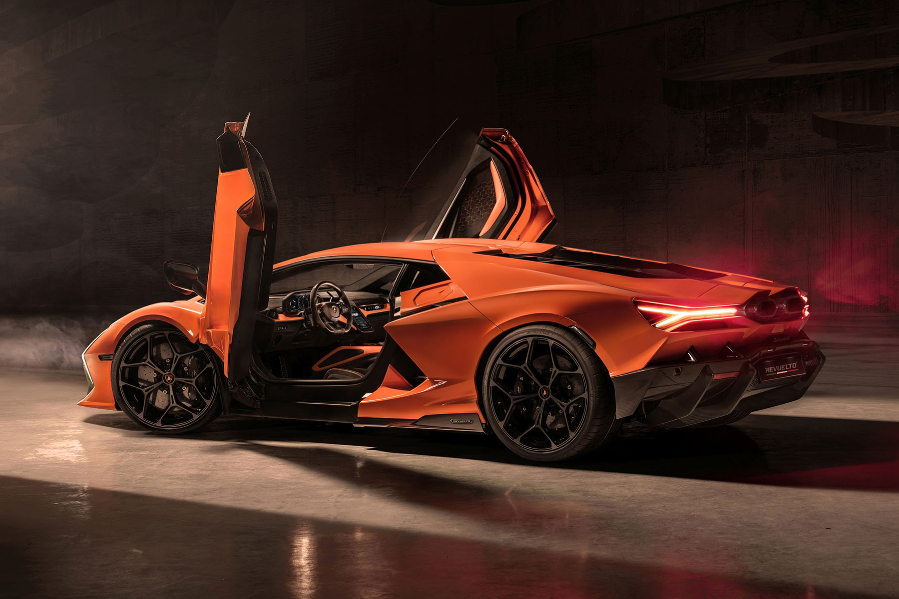 Weitere Merkmale des Revuelto sind die Carbon-Karosserie, nach oben öffnende Scherentüren, ein auf den Kotflügeln stehender einstellbarer Heckflügel und der freiligende Verbrennungsmotor in Längsanordnung. Letzterer ist sichtbar mit dem Doppel-Hexagonalauspuff verbunden, der mittig und mächtig aus dem Heck schaut.