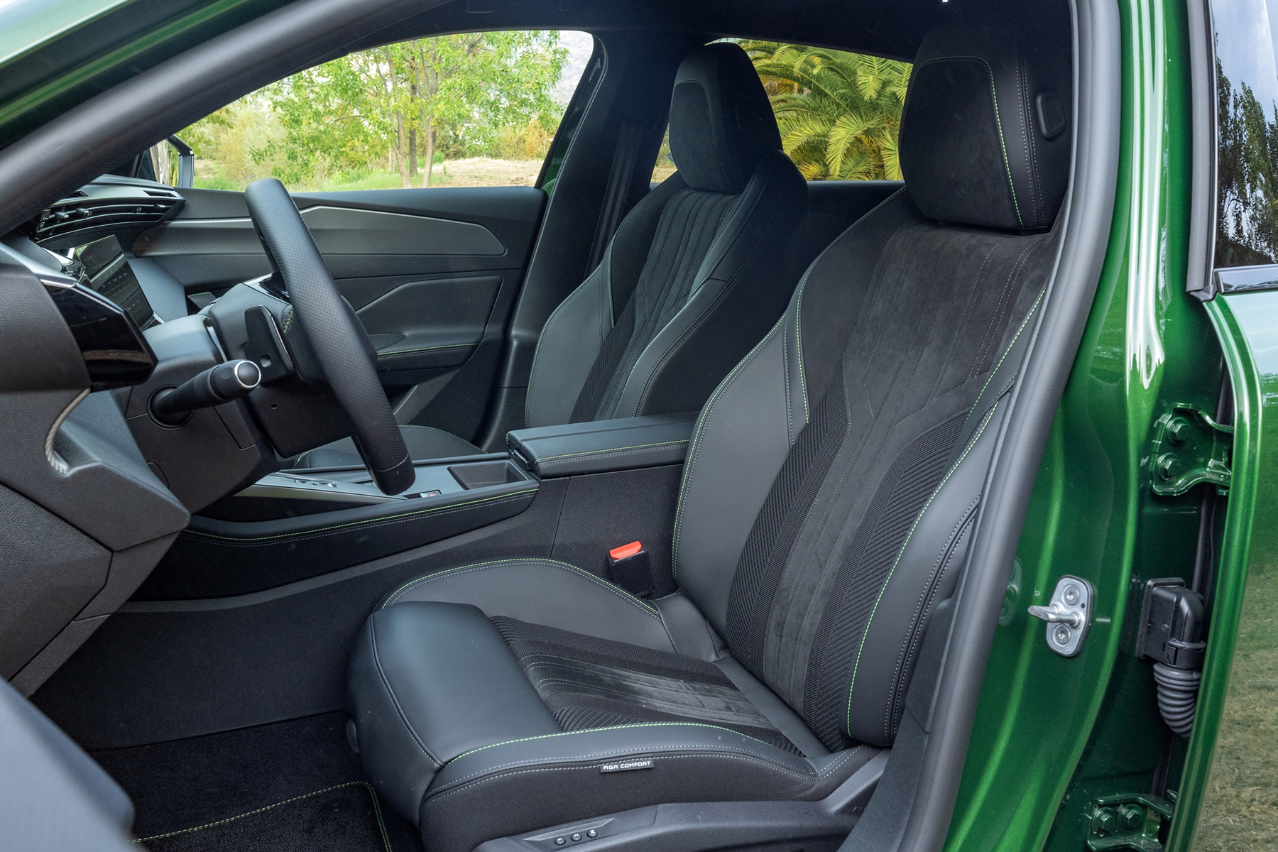 In seinem Innenraum macht der Franzose mit dem so genannten i-Cockpit vieles anders als andere Kompaktwagen. Inzwischen typisch für Peugeot ist das kleine Lenkrad mit den darüberliegendem Kombiinstrument. Bei der getesteten GT-Ausstattungslinie lassen sich zudem die digitalen Anzeigen dreidimensional darstellen. Dadurch entsteht der Eindruck, dass sie scheinbar frei im Raum schweben. Ein netter Effekt, der sich aber auch per Knopfdruck am Blinkerhebel abschalten lässt. Schön jedoch, dass sich die sich die Navi-Karte im Hintergrund formatfüllend anzeigen lässt.