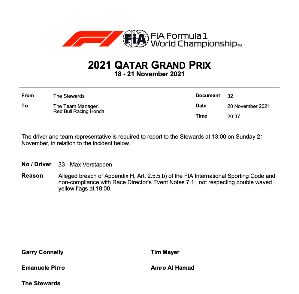 Jetzt ist auch Verstappens Urteil da: Seine schnellste Runde wird ihm gestrichen und er muss 5 (!) Startplätze zurück! Das heißt: Er startet von Platz sieben. Argumentation: Selbst wenn das Team den Fahrer nicht über die Gefahr informiert hat und Gelbphase auf dem Monitor der Rennleitung bereits beendet und ein doppelt gelber Sektor nicht angezeigt war, muss Verstappen auf eine doppel-gelb geschwenkte Flagge reagieren.